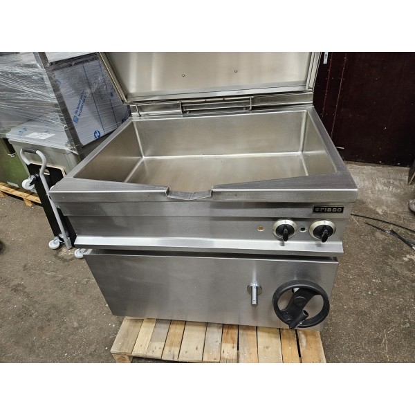 New electric tilting bratt pan. Professional 900 serie. Dimensions (WxDxH): 1000x900x900 mm. Electric power: 12.0 kW. Voltage: 380/400 V, 50/60 Hz. Capacity: 100 Liters. Temperature range: 50-250C Weight: 150 kg The supporting frame, panels and heating elements are made of stainless steel. The control is carried out by means of a thermostat. The bottom is reinforced with a special 8 mm stainless steel plate. The tilt mechanism is adjusted manually. If the pan is lifted, the heating element will turn off, which will ensure safe use. It is easy to fill and wash with water from the faucet located on top. Safety thermostat.