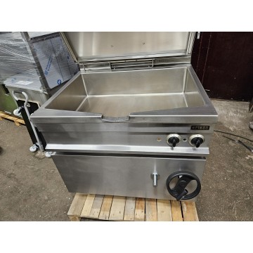Elektriskā ēdienu gatavošanas panna. Jauna. Profesionālā sērija 900. Izmēri (Pxdxa): 1000x900x900 mm. Elektriskā jauda: 12, 0 kW. Spriegums: 380/400 V, 50/60 Hz. Tilpums: 100 L. Temperatūras diapazons: 50-250C. Svars: 150 kg. Nesošais rāmis, paneļi un sildelementi ir izgatavoti no nerūsējošā tērauda. Vadība tiek veikta, izmantojot termostatu. Pannas apakšdaļa ir nostiprināta ar īpašu 8 mm nerūsējošā tērauda plāksni. Slīpuma mehānisms ir manuāli regulējams. Ja panna tiek pacelta, sildelements tiks izslēgts, nodrošinot lietošanas drošību. Viegli piepildīt un mazgāt ar ūdeni no krāna, kas atrodas augšpusē. Drošības termostats.