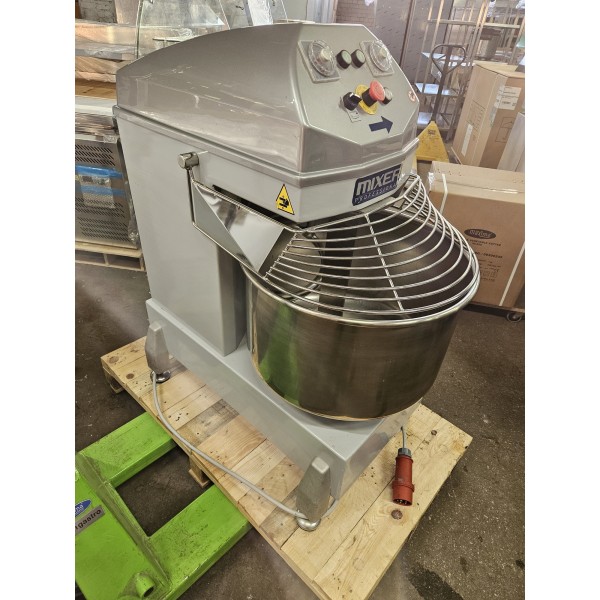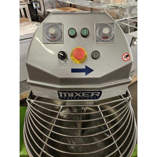 Верхняя часть неподъемная, дежа несъемная. Размеры: 565x945x1100 мм. Мощность, mаx: 1,85 кВт. Напряжение: 400 в / 50 Гц. Объем: 75 литров. 2 таймера. Количество теста (мин./ маx): 8/50 кг. Количество муки: (мин./ маx): 5/30 кг. Количество воды: (мин / маx): 3/20 кг. Число оборотов спирали: 95/189 об / мин. Скорость вращения бака: 8,5/17 об / мин. Все соприкасающиеся с тестом детали – из нержавеющей стали. Вес 190 кг.